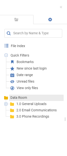 Quick Filters can be found in the data room on the left hand side above the files and folders. It includes the following sections:
